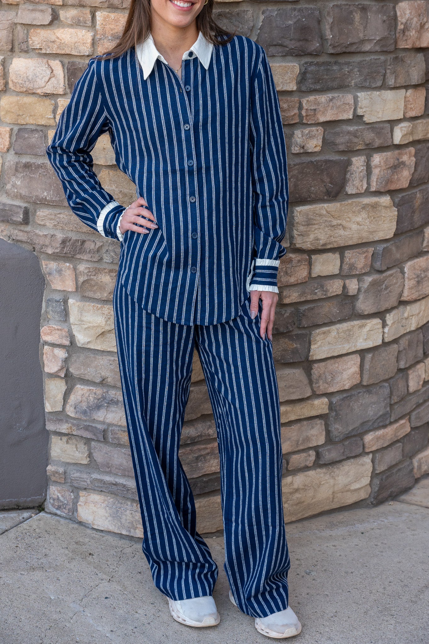 - Linen fabrication in a navy and white yarn dyed stripe