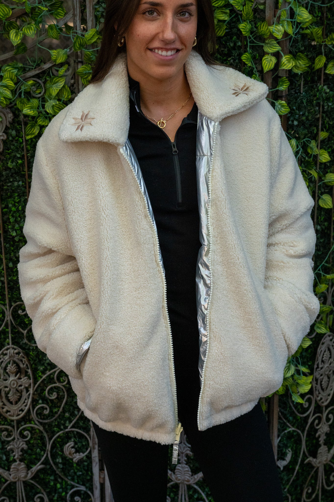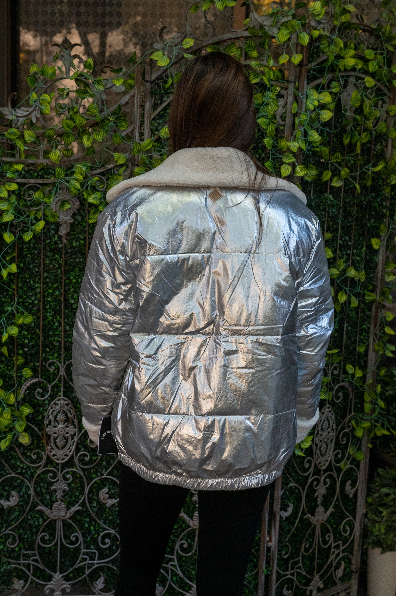 - Reversible quilted puffer jacket in silver metallic fabrication and faux shearling reverse